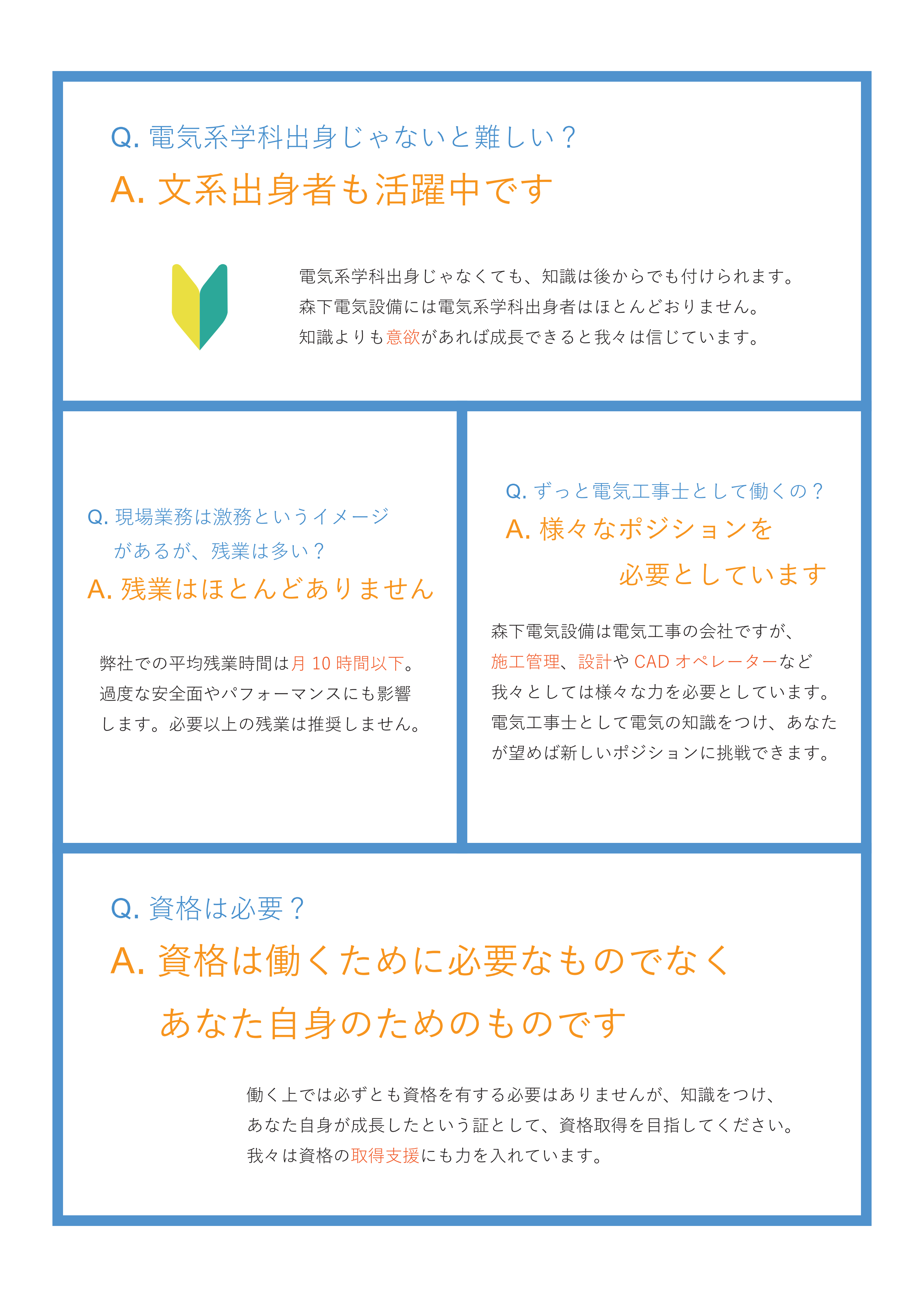 工場内の電気工事が主なる現場ですが、それ以外にビルや店舗の受変電設備工事も行っていますので幅広い技術が身に付きます。「中途採用=即戦力」というのが世間のイメージですが、同業界の同業種でも会社ごとに仕事内容が異なり、また仕事は共同作業であり、意思疎通が取れるまで優秀な方でも実際に即戦力になるまで時間は掛かります。弊社としてはサポートを怠らずにプロフェッショナルを育てていきたいと考えています。厳しい淘汰の時代に生き残れるための努力を惜しまない。そんな志を持ち、プロフェッショナルとしてスキルアップを目指す人材を弊社は求めています。